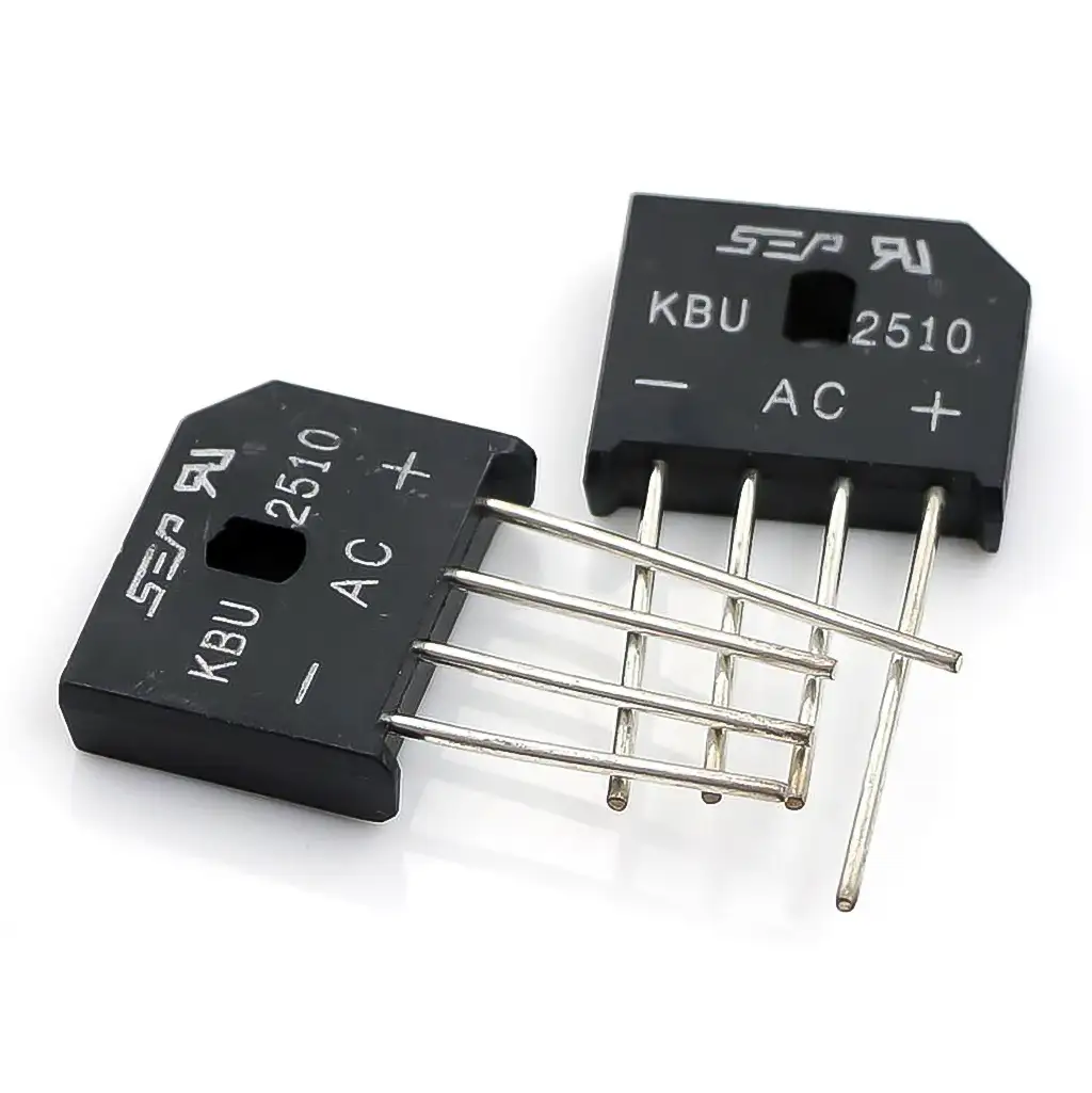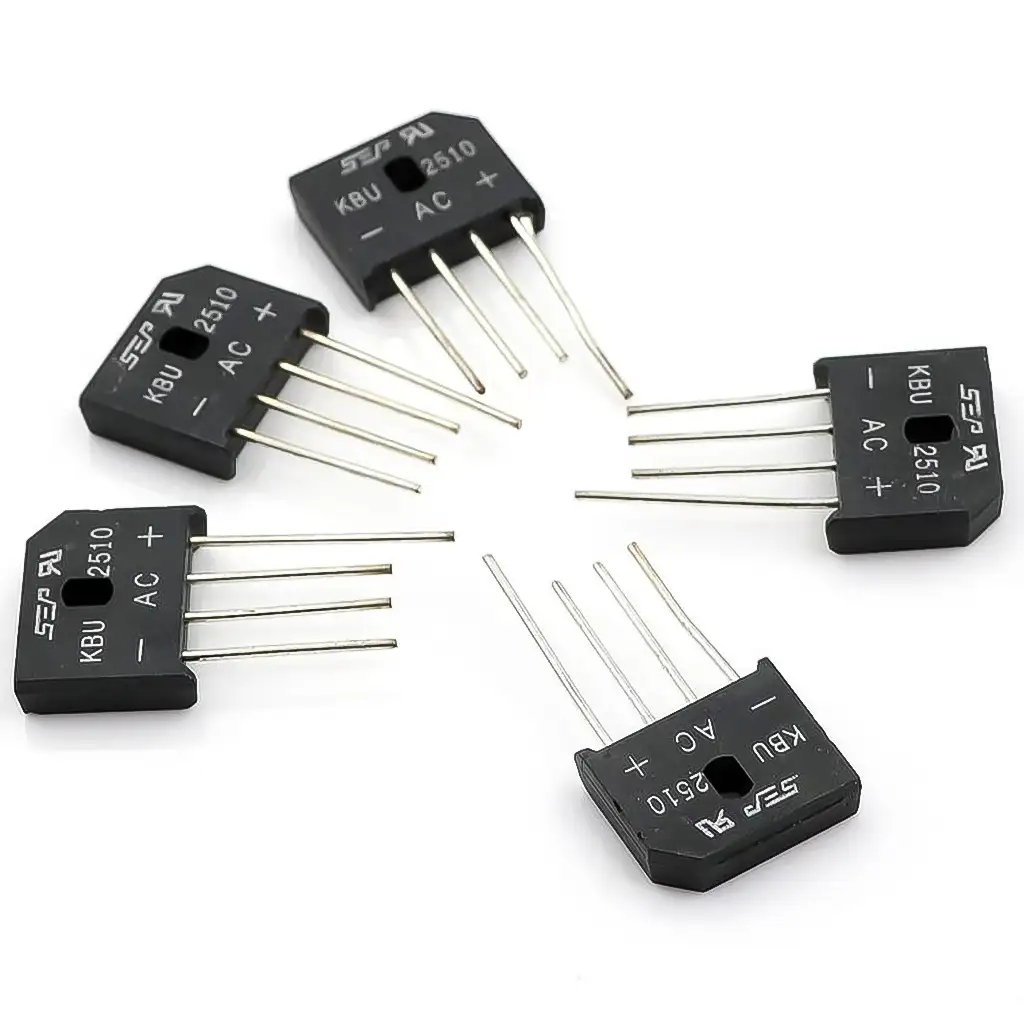 پل دیود KBU2510 شانه ای با تحمل جریان 25A و ولتاژ معکوس 1000V ، برای یکسوسازی جریان متناوب تک فاز در انواع منبع تغذیه خطی و سوئیچینگ مناسب میباشد.